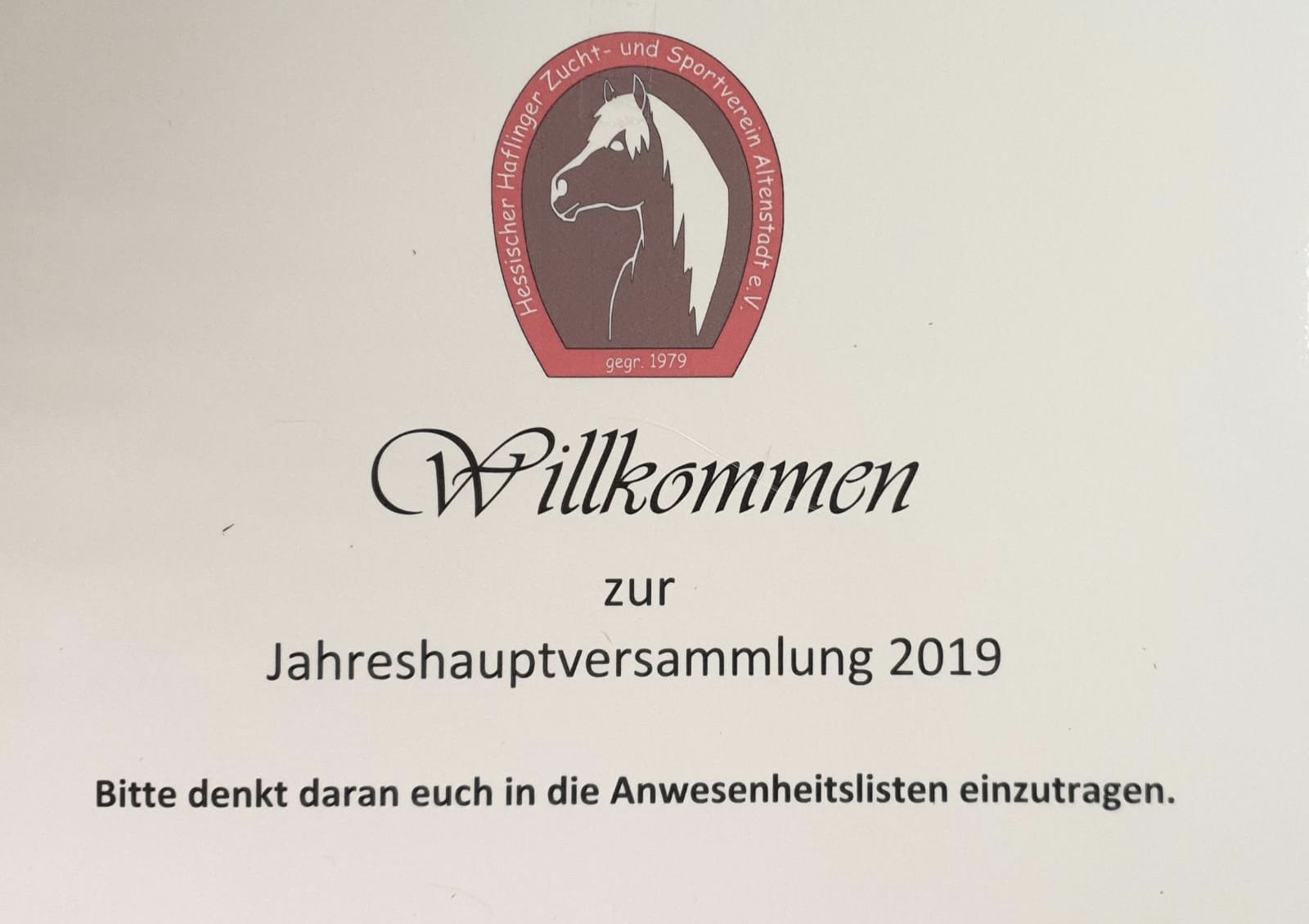 Dieses Schild begrüßte die 32 Teilnehmer der diesjährigen Jahreshauptversammlung des Hessischen Haflinger Zucht- und Sportverein Altenstadt e.V. bereits beim Betreten des Gasthauses „Das Schlemmerrestaurant“ in der Altenstädter Waldsiedlung am Sonntag, den 10.3.2019 um 11.00 Uhr.